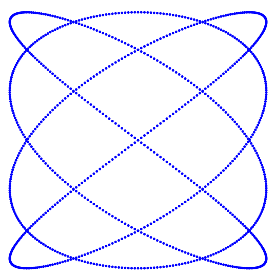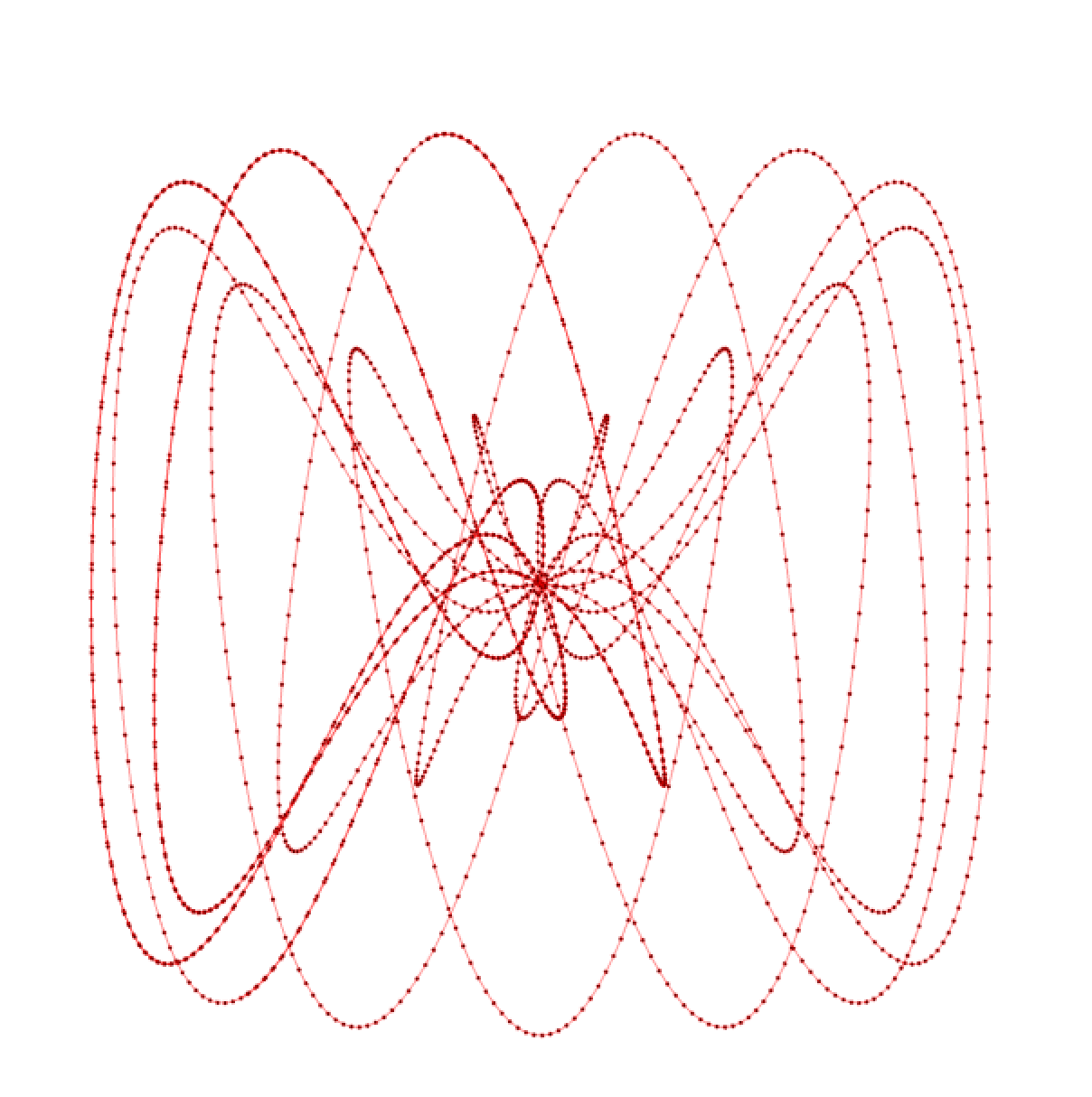 Now we are very close to a (frictionless) Harmonograph already and just need to add lines between the dots. For this we need to save our last position in a variable and use line() to connect them.