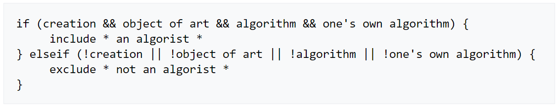 The Algorists where a loose group with a similar artistic endeavour. Besides their groundbreaking artistic output they also elevated the theoretical discourse. In 1995 Jean-Pierre Hébert presented his definition of the term in the form of a computer code. It is based on the invention of an algorithm to produce an artwork: