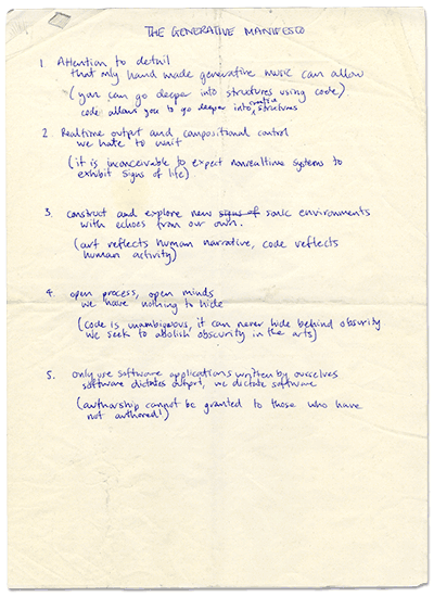 In 2000 Adrian Ward and Alex McLean presented their "Generative Manifesto". Although written from a musical perspective it still holds the core philosophy of the movement.